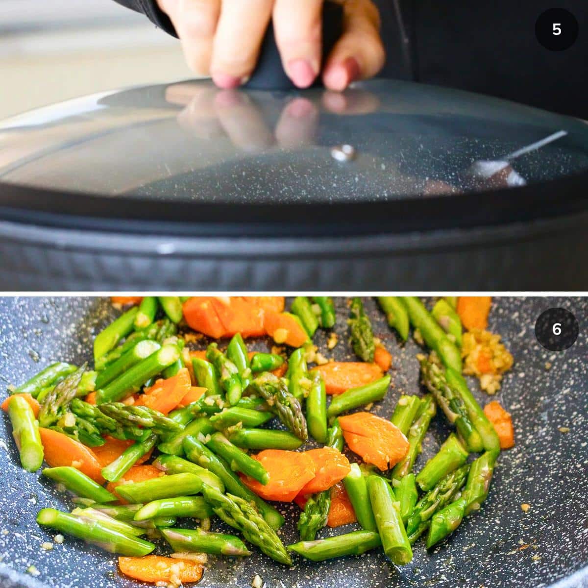 - Then, add 1 tablespoon of oil to the pan along with the steamed carrots. Next add ginger and garlic and fry a couple of seconds until aromatic. Then, add in the chopped asparagus and stir fry for about a minute until bright green and crisp tender. Remove the vegetables from the pan and place in a dish. Keep the vegetable dish and the prepared sauce near the pan as you are going to be adding them back into the pan very shortly.