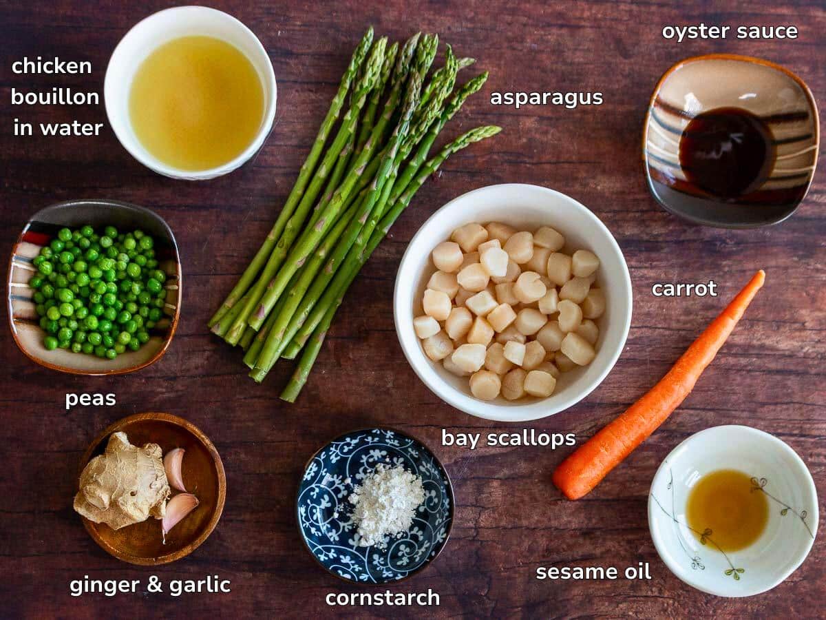 Spring Veggies like asparagus, peas and carrots add a pop of freshness to this Asian bay scallop stir fry. Feel free to substitute with your favorite seasonal vegetables of choice.