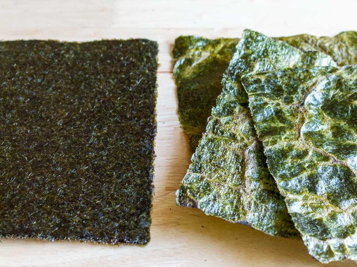 showing the difference of the seaweed sheets before and after roasted turning from dark green to bright green.