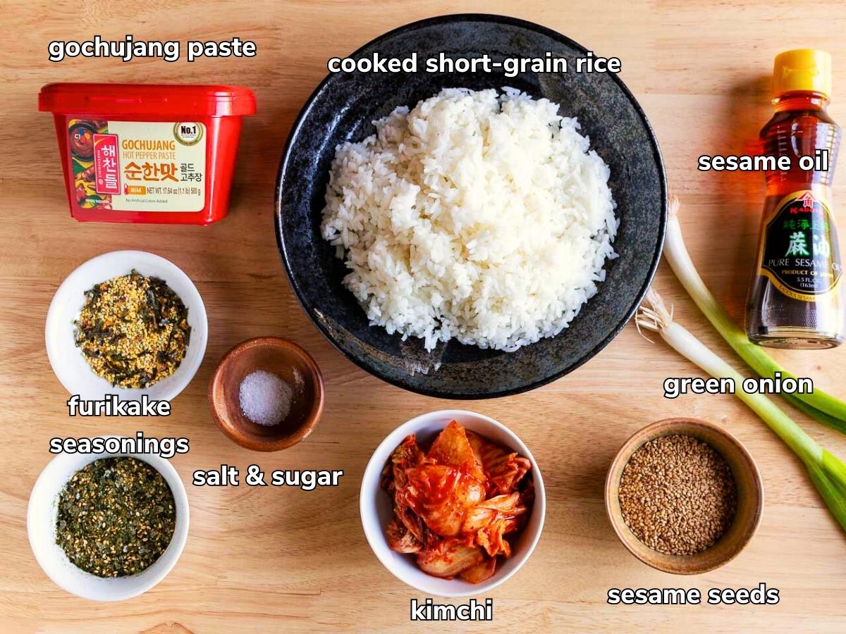 Ingredients to make Korean rice balls laid out on a wooden table.
