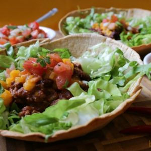 - While your flour tortilla bowls are baking, heat up your chill con carne, slice your lettuce and prepare your salsa.