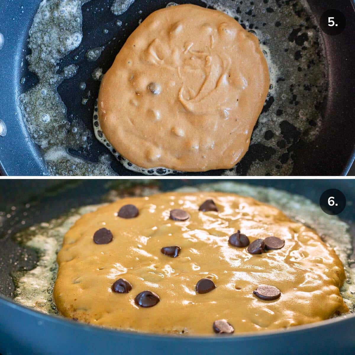 - Turn your burner on a low medium heat and add a pat of butter (plant based butter) in pan or griddle to coat it. Ladle in about ¼ cup batter to pan for each pancake. Sprinkle on a few dark chocolate chips on each pancake.