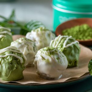 - If you are feeling creative, place a little of either the white or green matcha melted chocolate in a piping bag and drizzle over the balls. Enjoy!