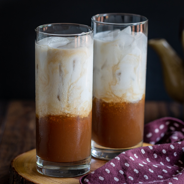 - Add ice cubes to 4 glasses, add ½ cup Masala Chai Organic Black Tea sweetened with date paste or sweetener of choice. Add about 3.4 ounces or ¼ of the canned coconut milk on top of each glass of Masala Chai Organic Black Tea sweetened with date paste. Enjoy!