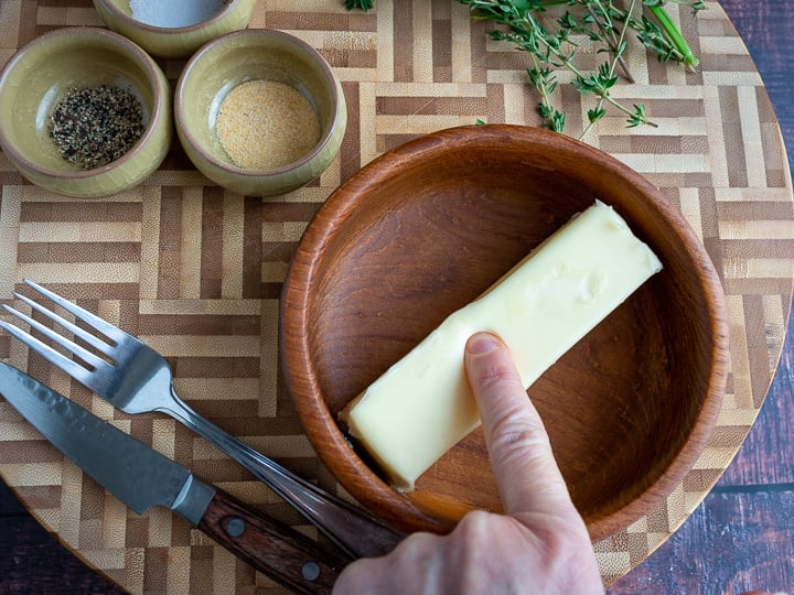 You can use either fresh or dried herbs in this easy herb butter recipe. However, fresh herbs are absolutely amazing. Use what you have on hand is our motto. We had fresh thyme and parsley. Fresh rosemary would be lovely in here as well. Use 2 heaping tablespoons of finely minced fresh herbs of choice to 8 tablespoons of butter. If you are using dried herbs, use a total of 2 teaspoons of dried herbs of choice.