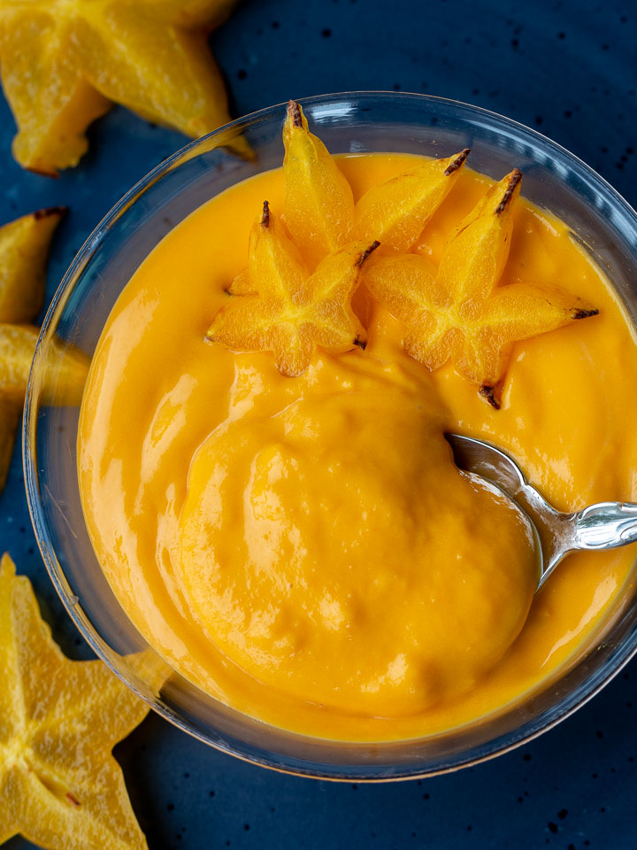 - Place the dessert soup into bowls. Garnish with star fruit, lemon zest, raspberries, pomegranate seeds, passion fruit, goji berries, etc. and Enjoy! (A bright slightly sour fruit pairs really well with this naturally sweet tropical dessert.)