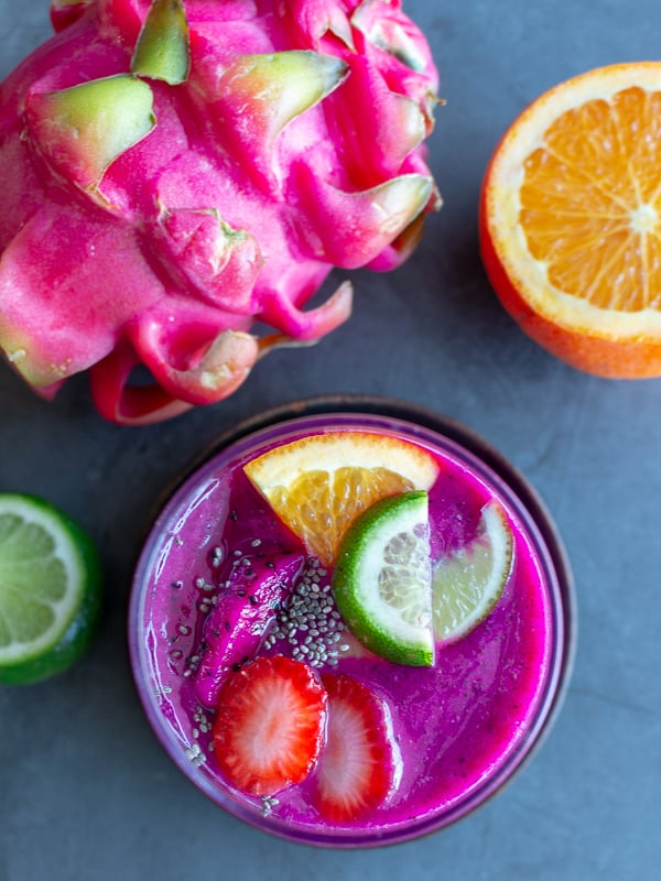 Ginger Citrus Dragon Fruit Smoothie is a deliciously creamy breakfast or tropical snack packed with gut friendly ginger, red dragon fruit (pitaya) fresh citrus fruits and bananas for a tropical sip any time of the day. (dairy-free, gluten-free, vegan and refined sugar-free)