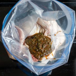In addition to the Moroccan spice blend, we added parsley, lemon zest, lemon juice and olive oil for a fresh and delicious marinade. We like to marinate our little split Cornish game hens for about 30 minutes but also can be left up to overnight, if desired. Be sure to cover and refrigerate if marinating overnight.