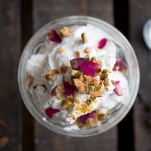 - Spoon or pipe your Lemon Rose Cardamom Cheesecake Mousse into little cups and garnish with pistachio nuts and edible rose petals. Enjoy!