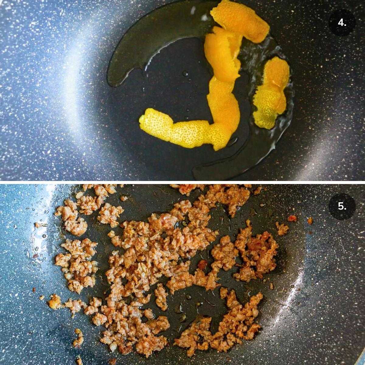 - Panfry the orange zest in oil until aromatic and lightly golden around the edges and remove.
