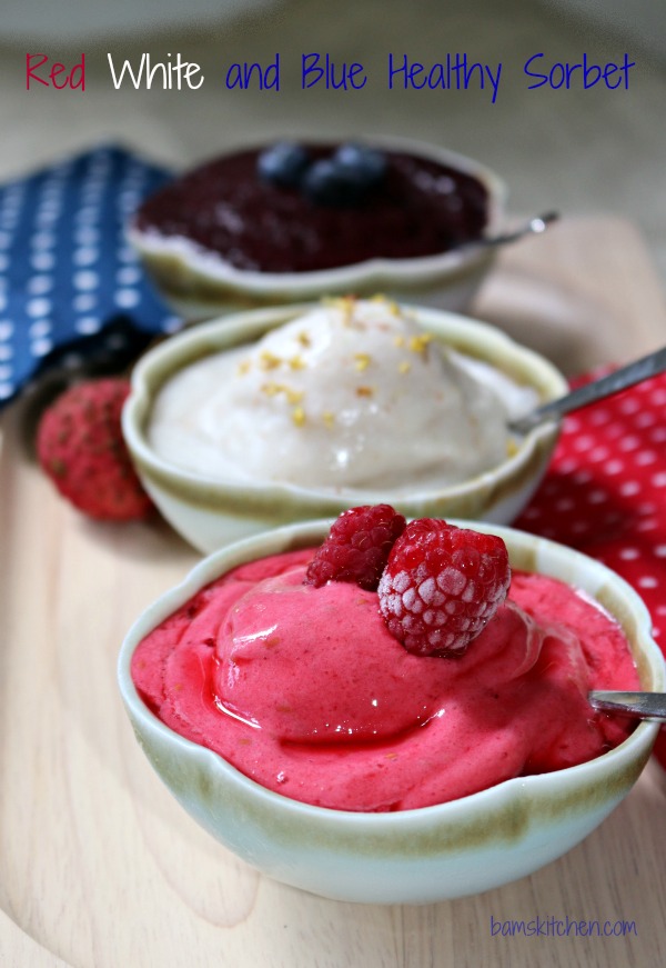 These no-churn 3 Healthy Sorbet Recipes are bursting with Lychee, Raspberry and Blueberry flavors for a fun patriotic red, white, and blue frozen fruit dessert. No ice cream maker required. Only 3 ingredients and ready in under 10 minutes. So low in sugar, you could eat this vegan treat for breakfast!