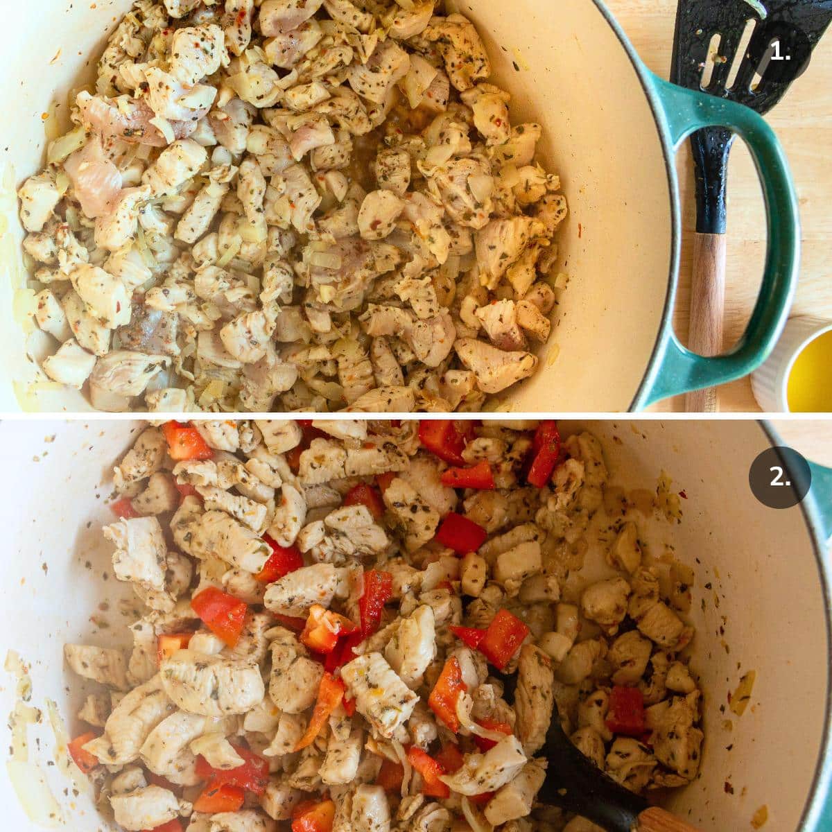 - Next, add the chopped chicken, Italian seasoning, garlic, red pepper flakes and salt and pepper to the pot with the onions. Sauté and stir until the chicken is almost cooked through -approximately 3 to 4 minutes.