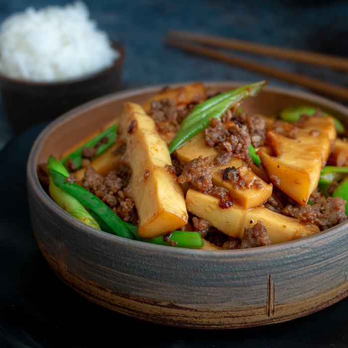 However, feel free to exchange with ground beef, ground turkey, ground lamb, ground chicken or many seared tofu if you are vegan. We feel that using minced or ground protein allows all the flavors to mix in with the bamboo shoots.