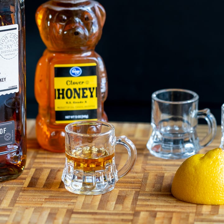 2 shots of Whiskey Honey Lemon Cough Syrup with a bottle of honey and whiskey and a half a lemon on a cutting board.